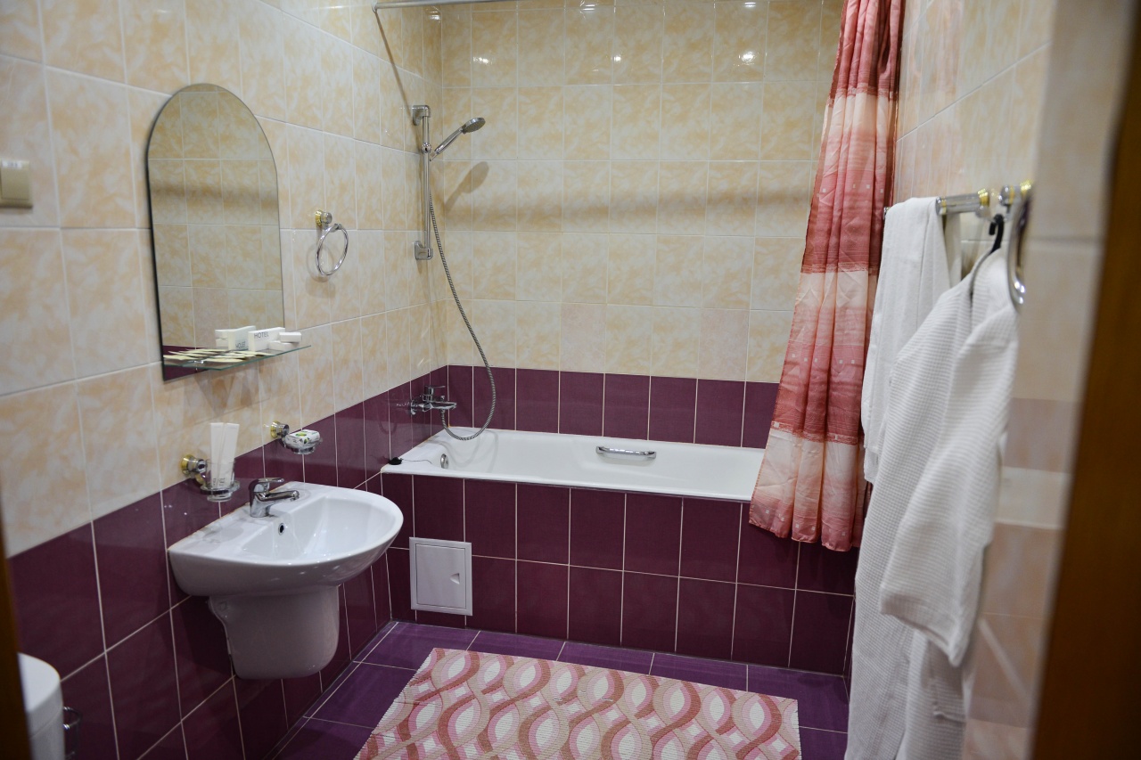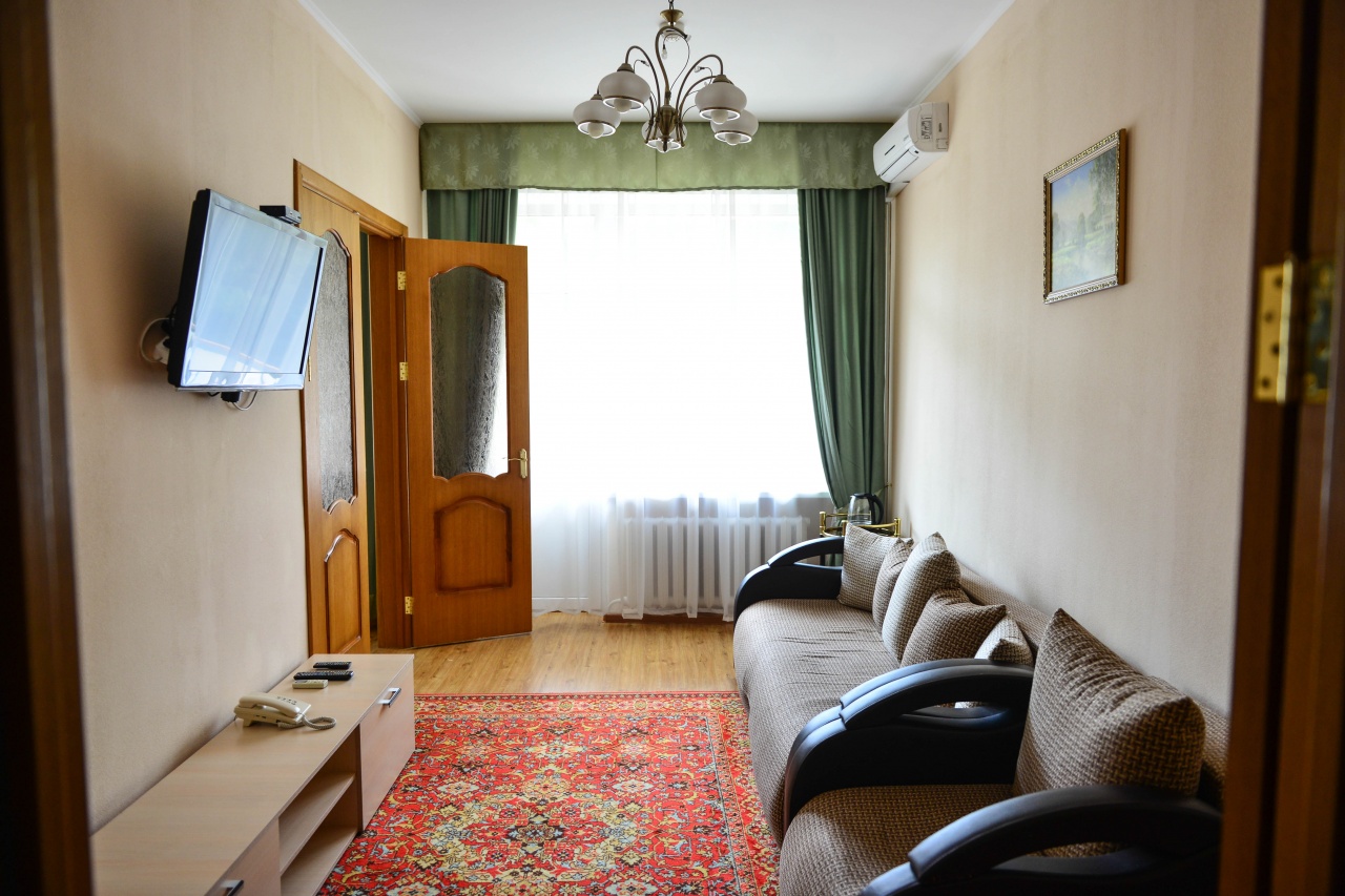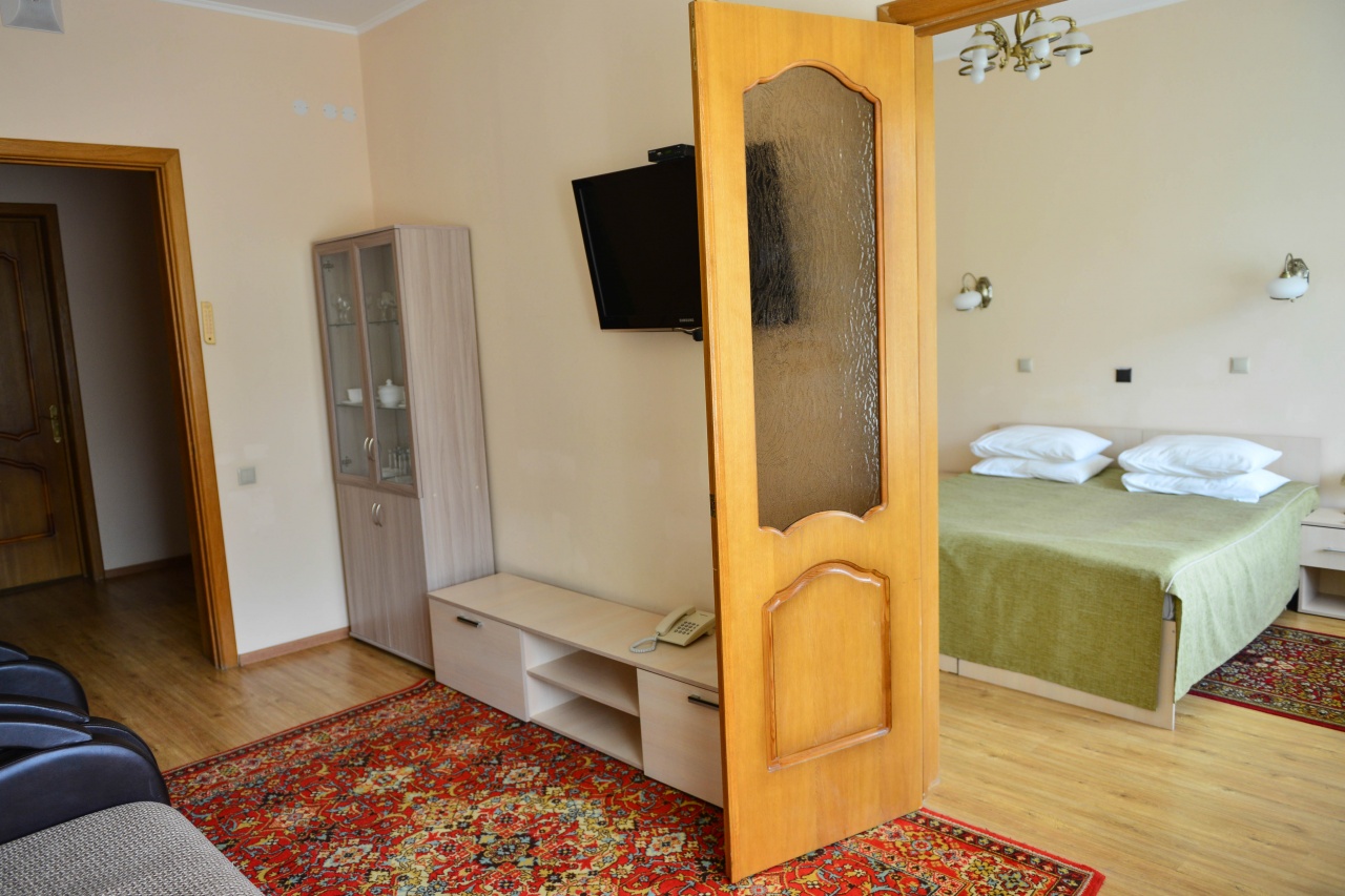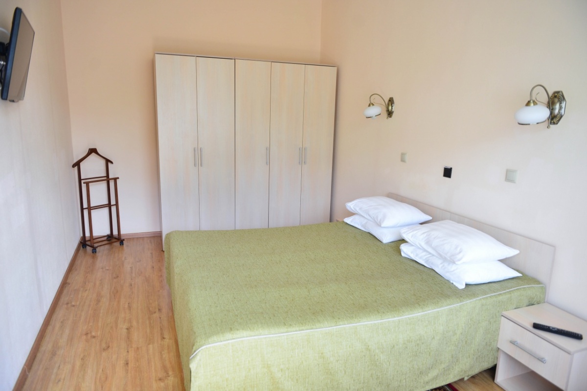 Площадь номера - 31-43 кв.м. 2 осн. места. 2 доп. места. Балкон. Мебель: вешалка, кровати односпальные /одна двуспальная кровать, набор мягкой мебели, прикроватные тумбочки, стол, стулья, шкаф. Оборудование: компьютер, набор посуды, телевизор, телефон, холодильник, электрочайник. Санузел: с ванной, тапочки, туалетные принадлежности, фен, халат. Сервис: смена полотенец, смена постельного белья, уборка номера.