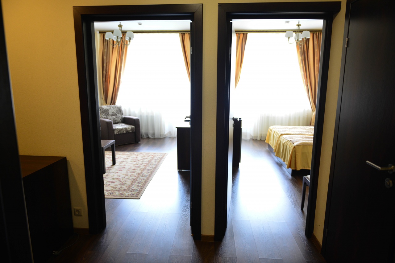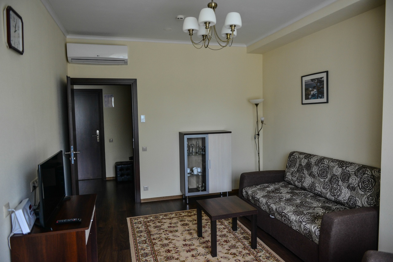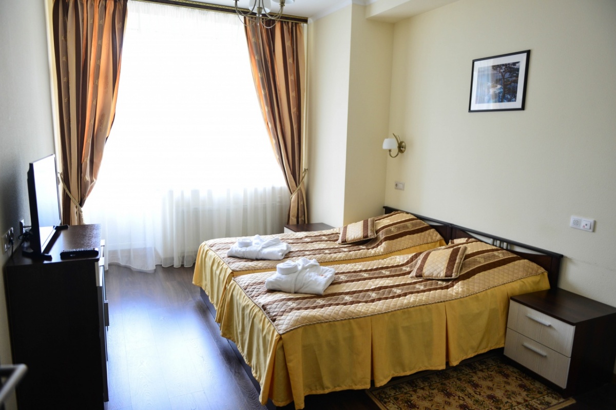 Площадь номера - 25-31 кв.м. 2 осн. места. 2 доп. места. Балкон. Мебель: вешалка, зеркало, кровати односпальные /одна двуспальная кровать, прикроватные тумбочки, стол, стулья, шкаф. Оборудование: гладильная доска, кондиционер, сейф, телевизор, телефон, утюг, холодильник, чайный набор посуды, электрочайник. Санузел: с душевой кабиной, тапочки, туалетные принадлежности, фен, халат. Сервис: смена полотенец, смена постельного белья, уборка номера.
